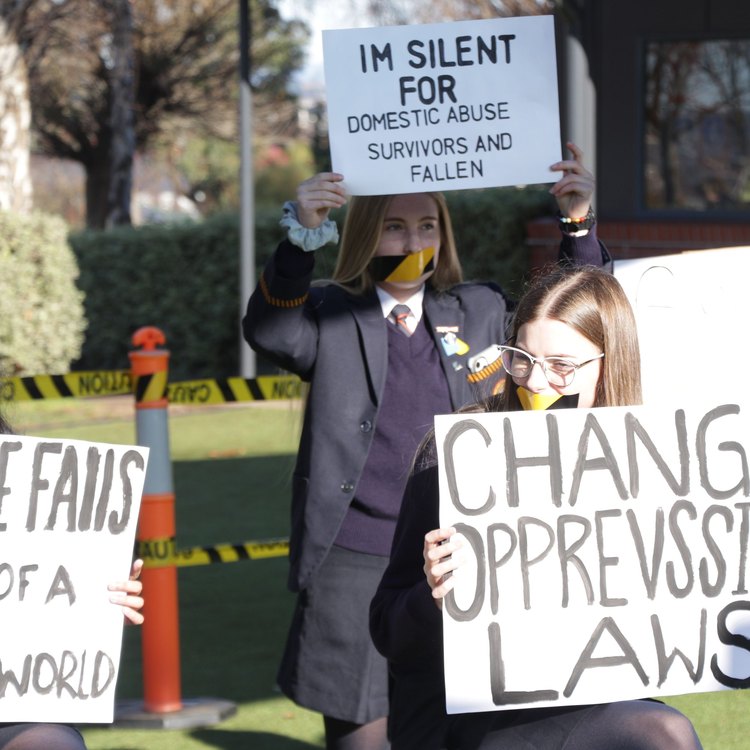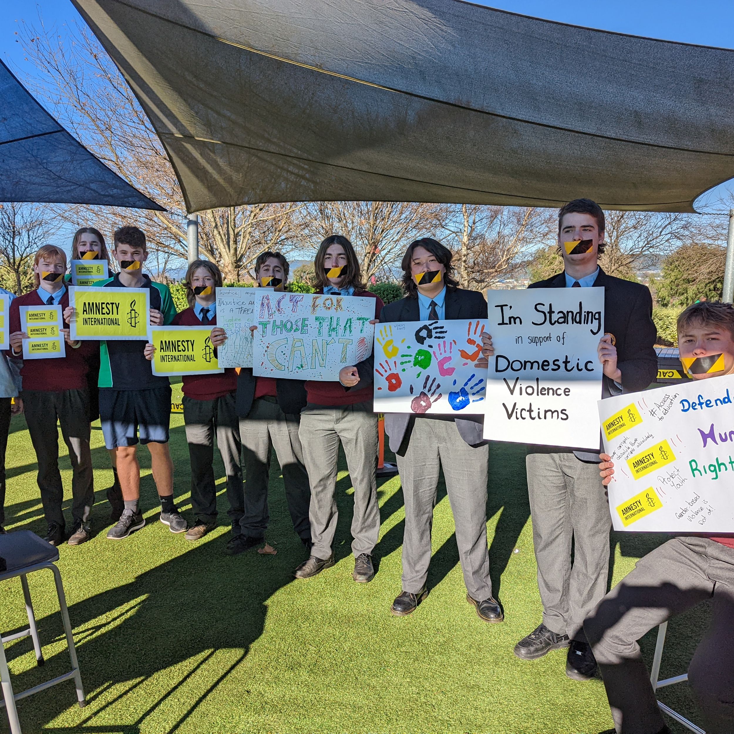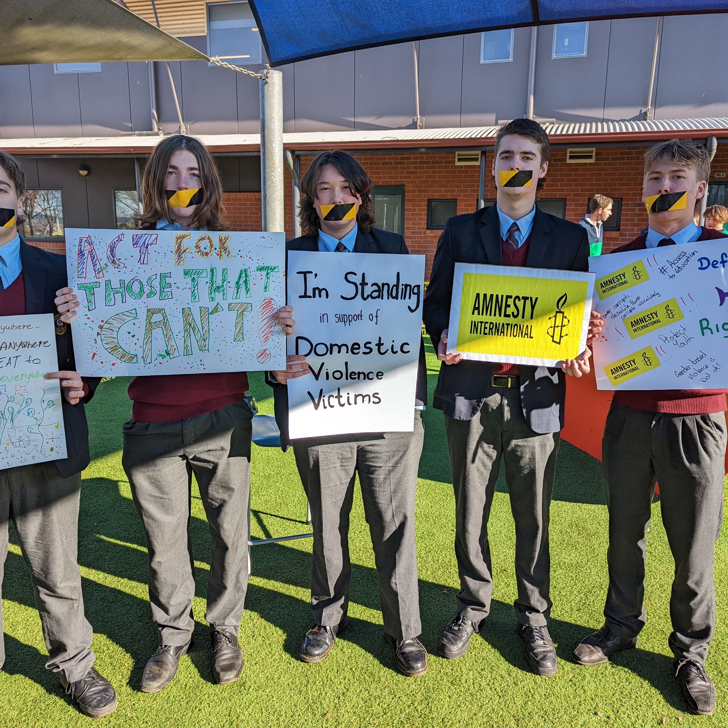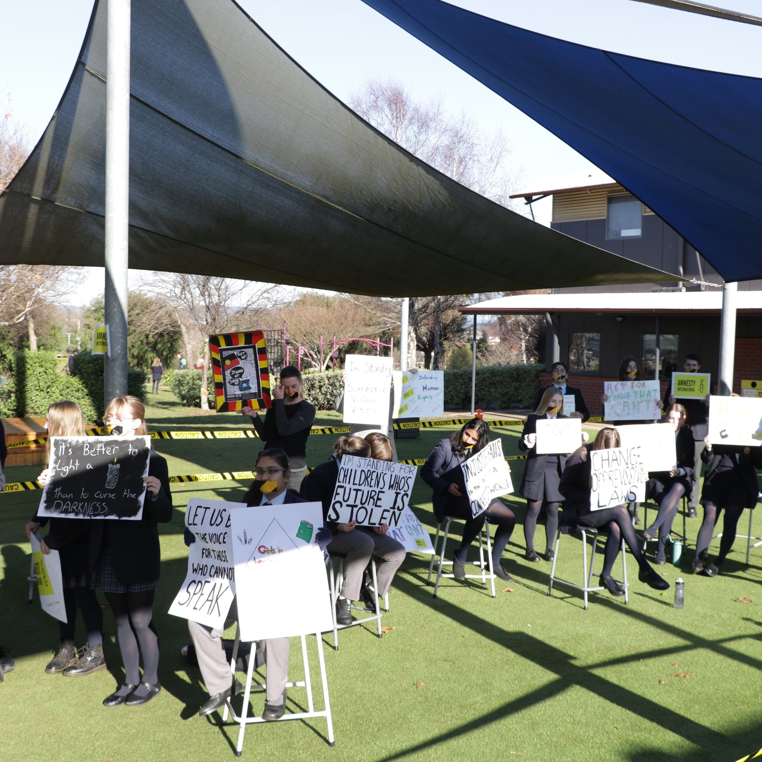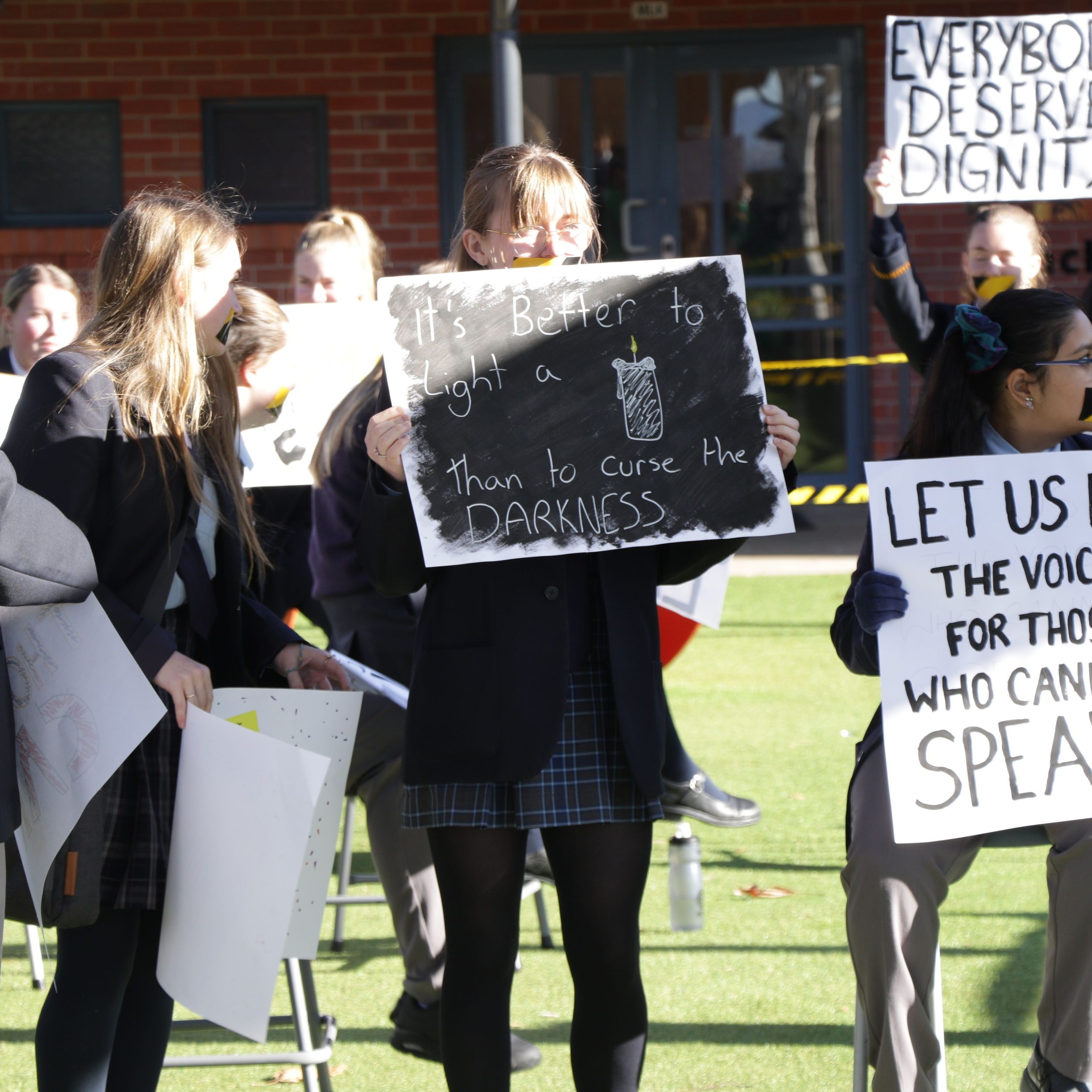 On Tuesday 5 July, during recess, our Vinnies group conducted a silent sit-in as an act of solidarity for all refugees and asylum seekers and first nations people who are unable to speak up for themselves, through fear, persecution or suppression. Students and staff took part by optionally covering their mouths with tape and holding up signs.