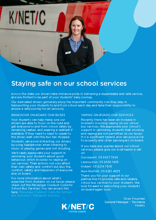 I would like to wish all students and staff a well-deserved holiday period. A reminder to parents that the first Monday back is a student-free day, mandated across the state by CET. However, pre-tertiary subjects will still run due to the closeness of exams and staff wanting to support our students during this important time.