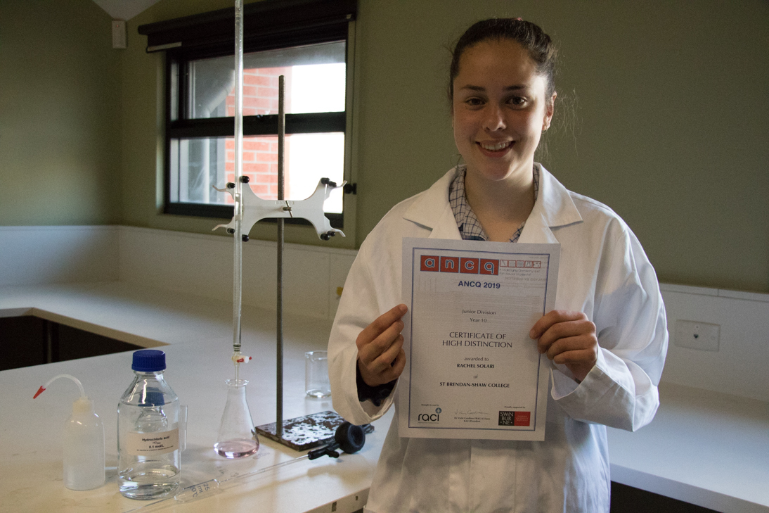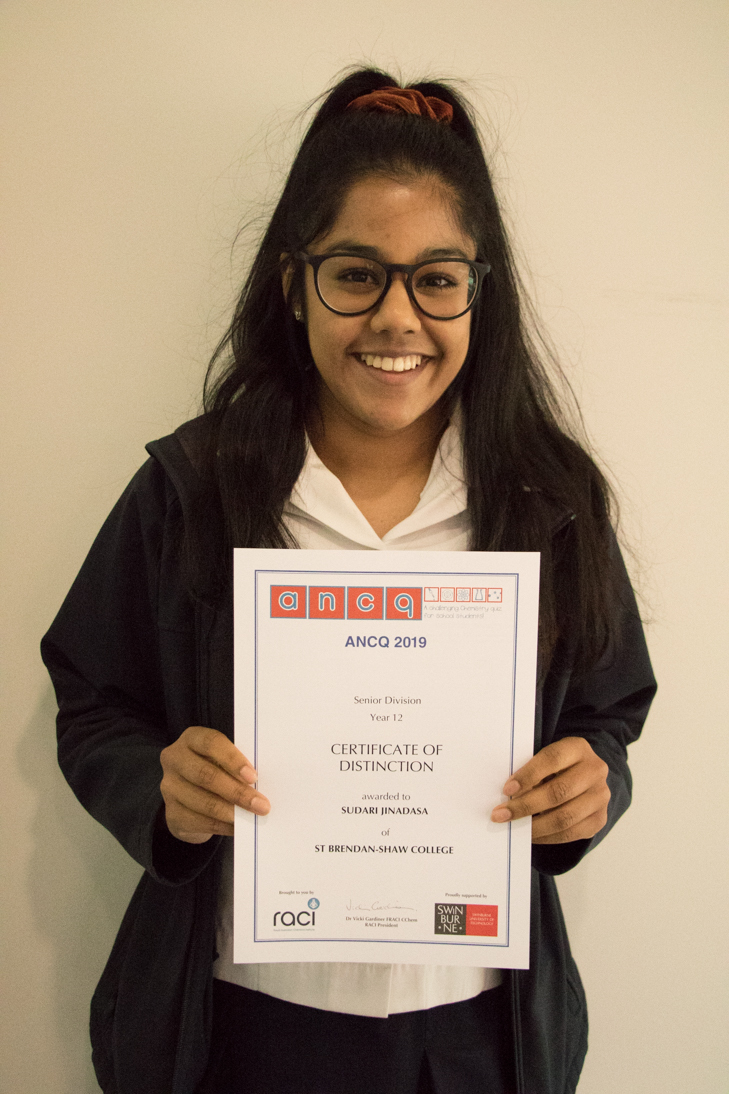 Congratulations to Rachel Solari (above) who was awarded a Certificate of High Distinction for the Year 10 Junior Division of the ANCQ Quiz (the ANCQ is the Premium Chemical Education activity run by the Royal Australian Chemical Institute), and Congratulations to Sudari Jinadasa (below) who was awarded a Certificate of Distinction for the Year 12 Senior Division.